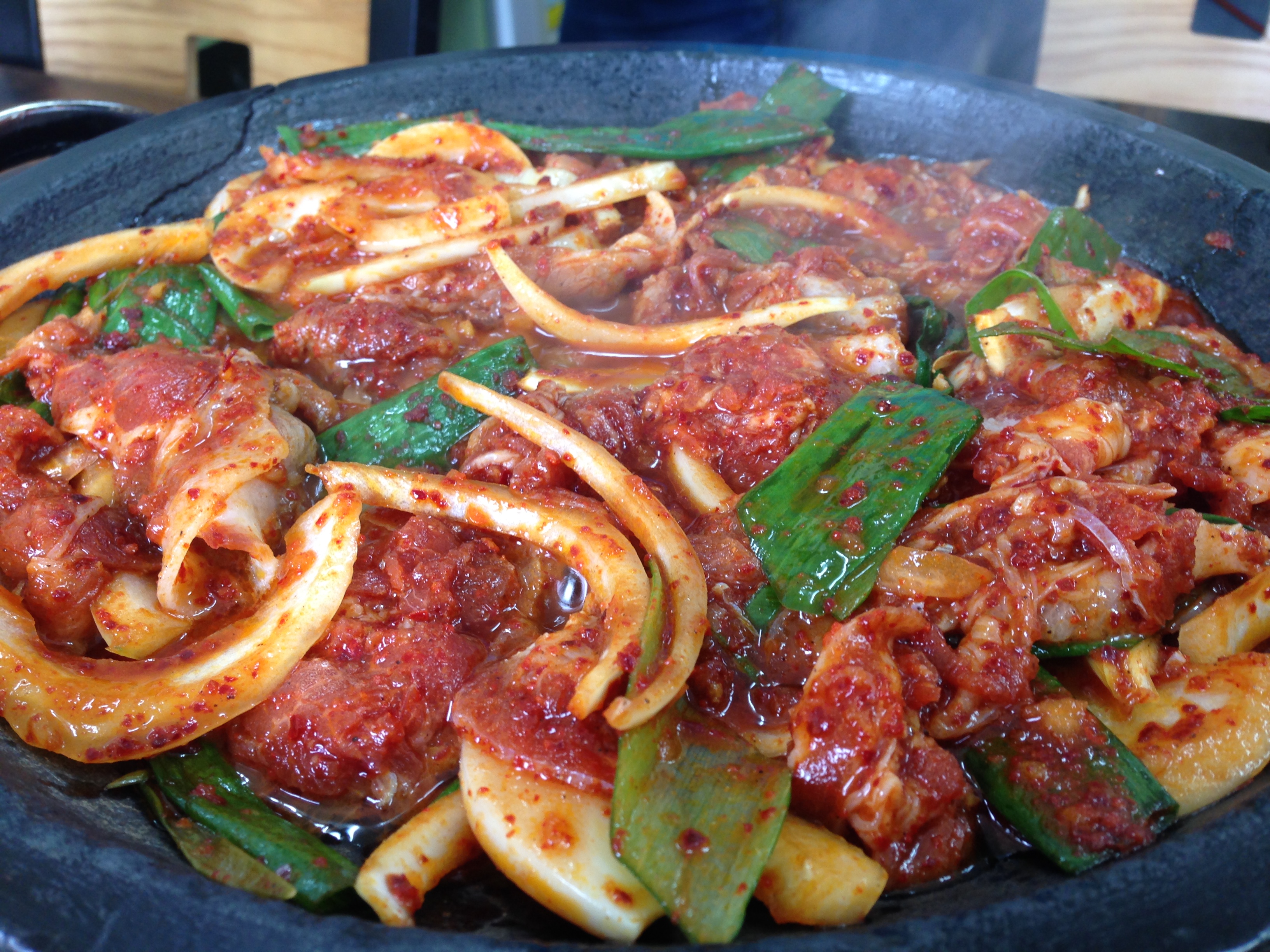 고기 질이 그렇게 뛰어나다는 생각이 들지는 않지만 매콤한 양념에 돌판에 지글거리며 구우면, 게다가 그 가격이면 먹을만하다.