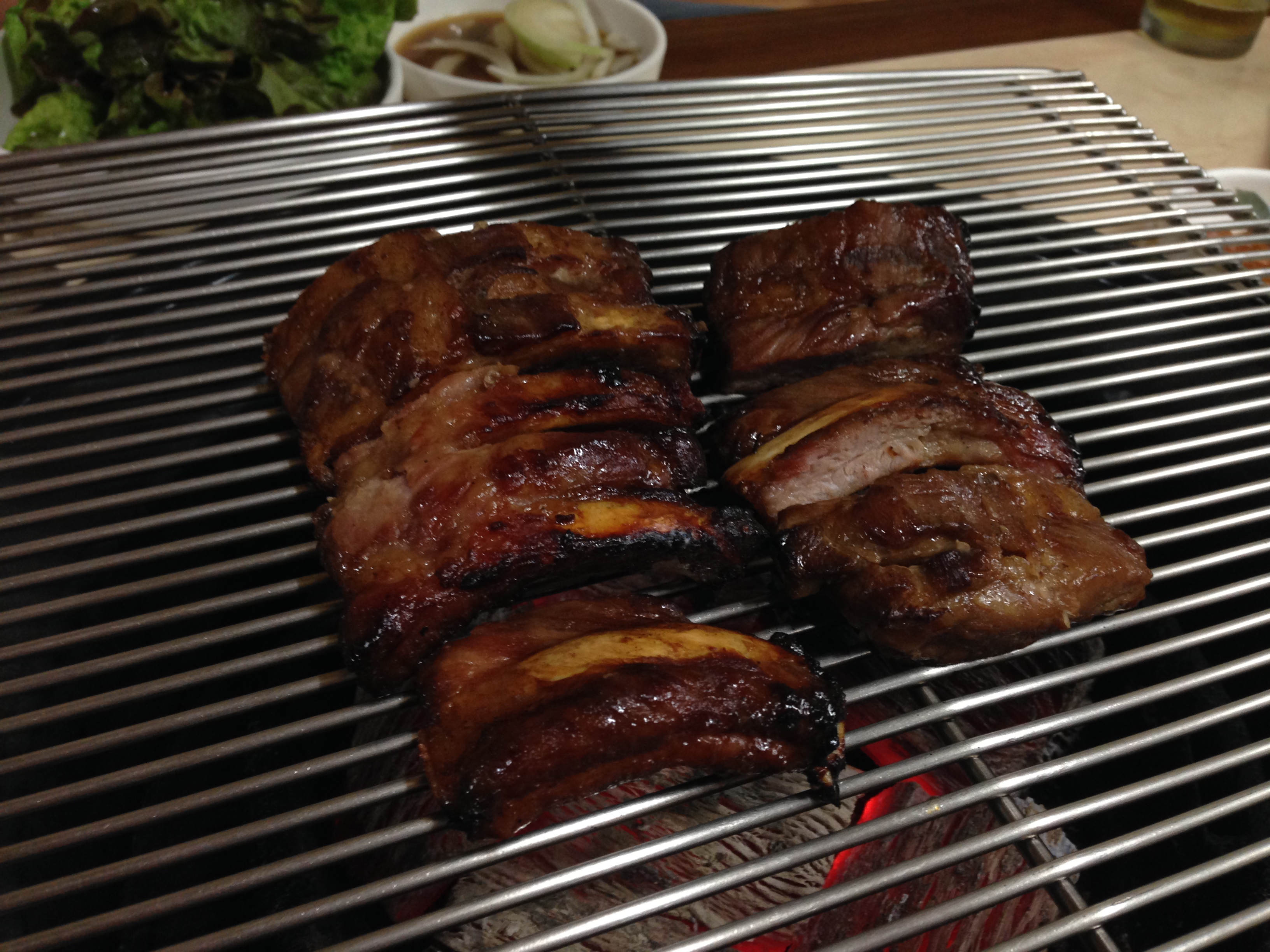 고기는 약 80% 가량 익혀진 상태로 나오기 때문에 숯불 올린 석쇠 위에서 지글지글거릴 정도로 구워 먹으면 된다.