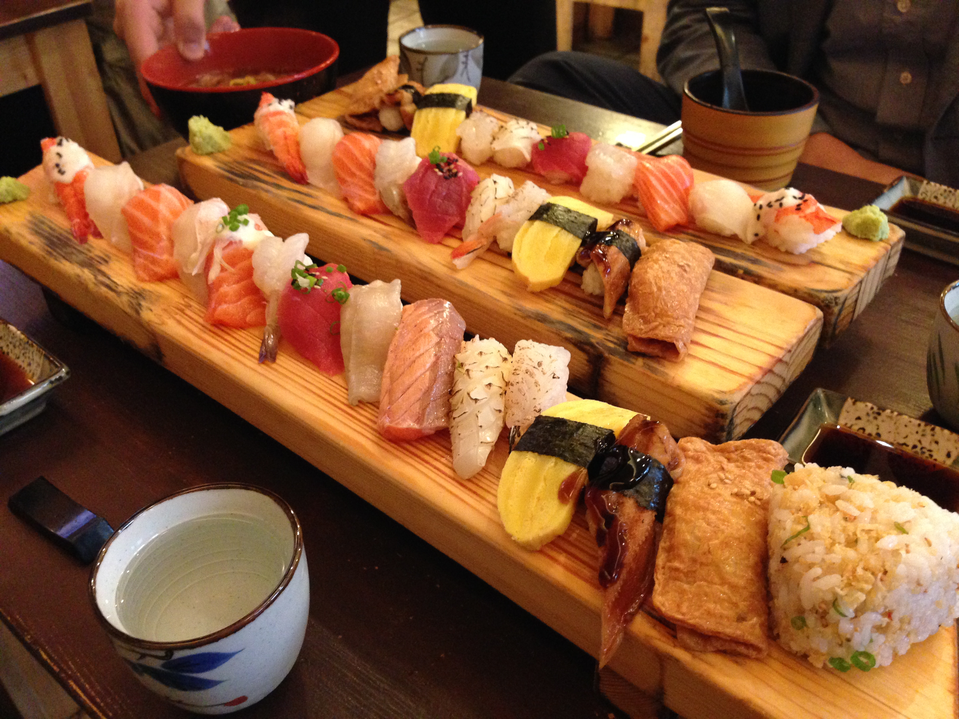 딱딱한 생선이랑 삶은 새우 등 두세 종류의 초밥을 다른 음식들과 함께 담아서 시끌벅적 소란스런 분위기에서 먹다보면 이게 무슨 맛인지 코로 먹는지 귀로 먹는지 알 수 없었던 것이 첫 경험일 가능성이 높다.
