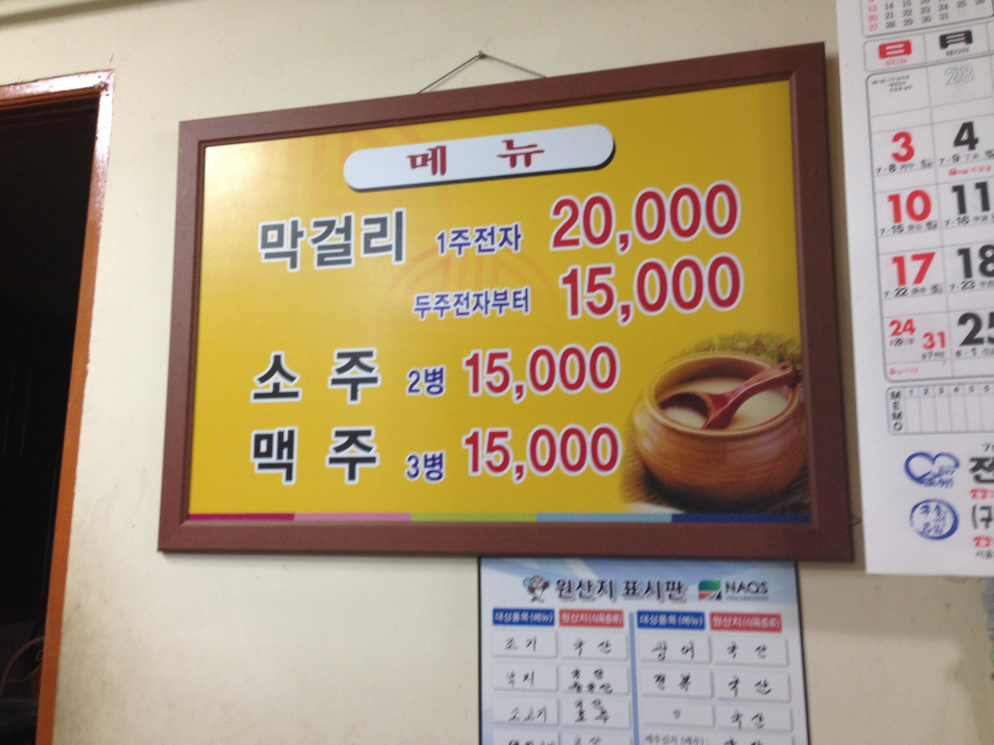 막걸리 한 주전자에 2만원, 그 이후 추가로 시키면 주전자당 만5천원인데, 한 주전자를 시키면 일단 ‘상다리가 부러지게’ 안주가 쫙 깔리고 추가로 시킬 때마다 새로운 안주가 깔리는 시스템이다.