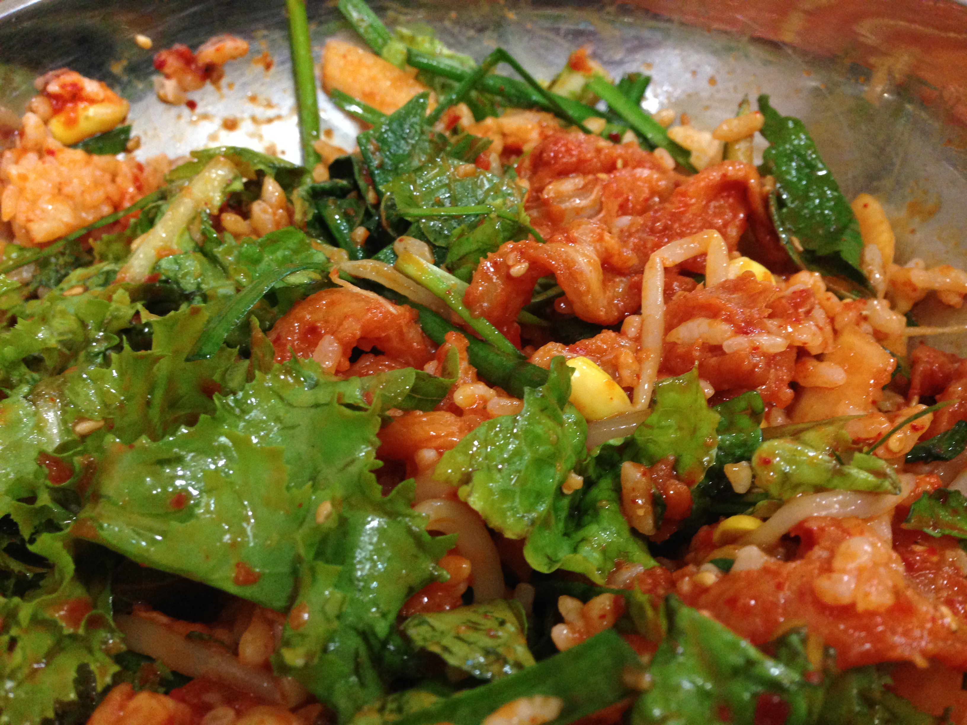 서대회는 야채에 버무려서 주지 않고 무친 서대회에 야채를 얹어 주는 형식으로 참기름을 살짝 두르고 서대회 무침을 밥에 척척 올려 비벼먹으면 된다.