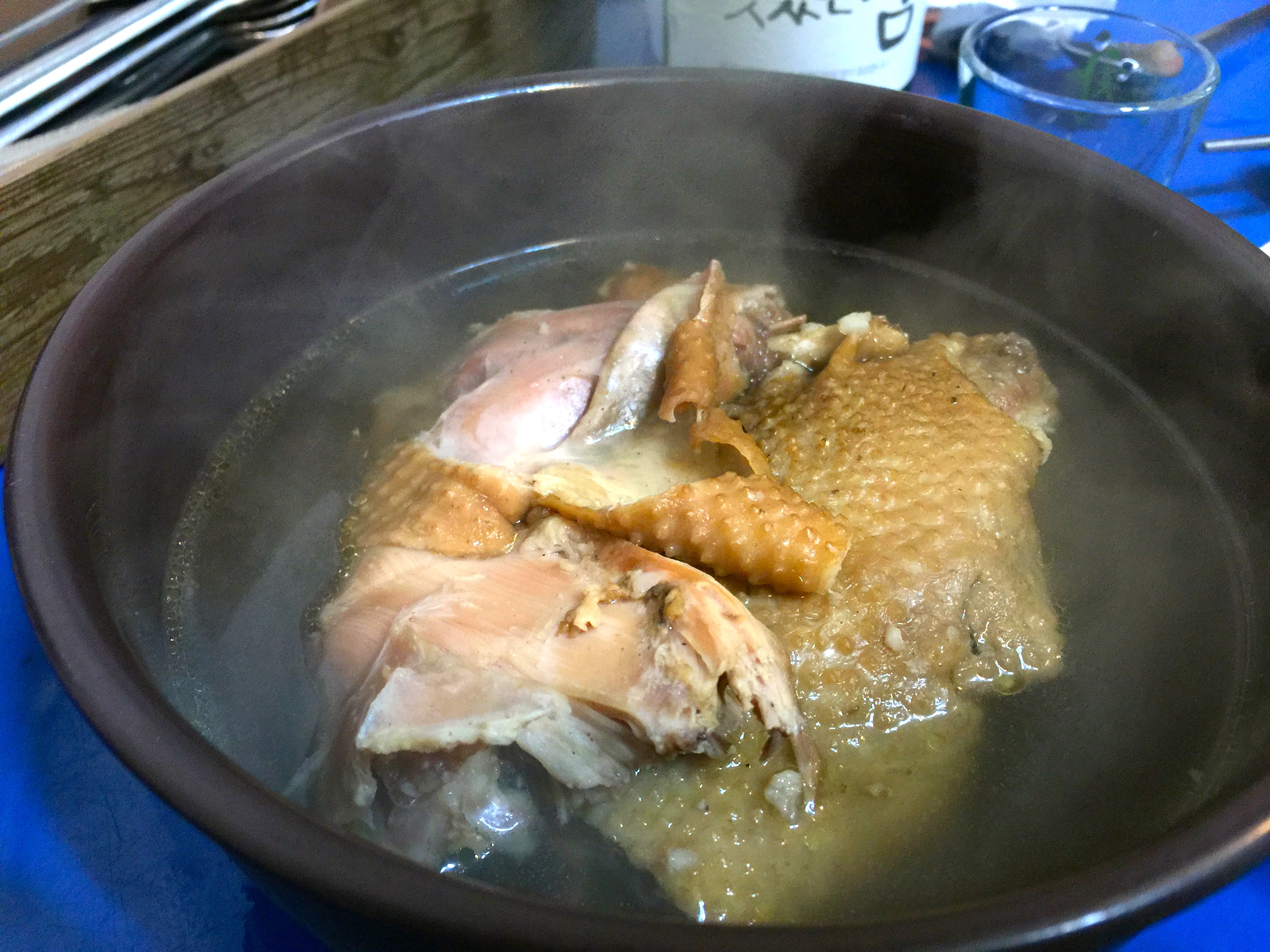 이 날의 경우 가게 안 난로 위에 큰 냄비를 올려놓고 닭을 삶고 있었는데 한 토막을 기본안주로 내어 주었다.