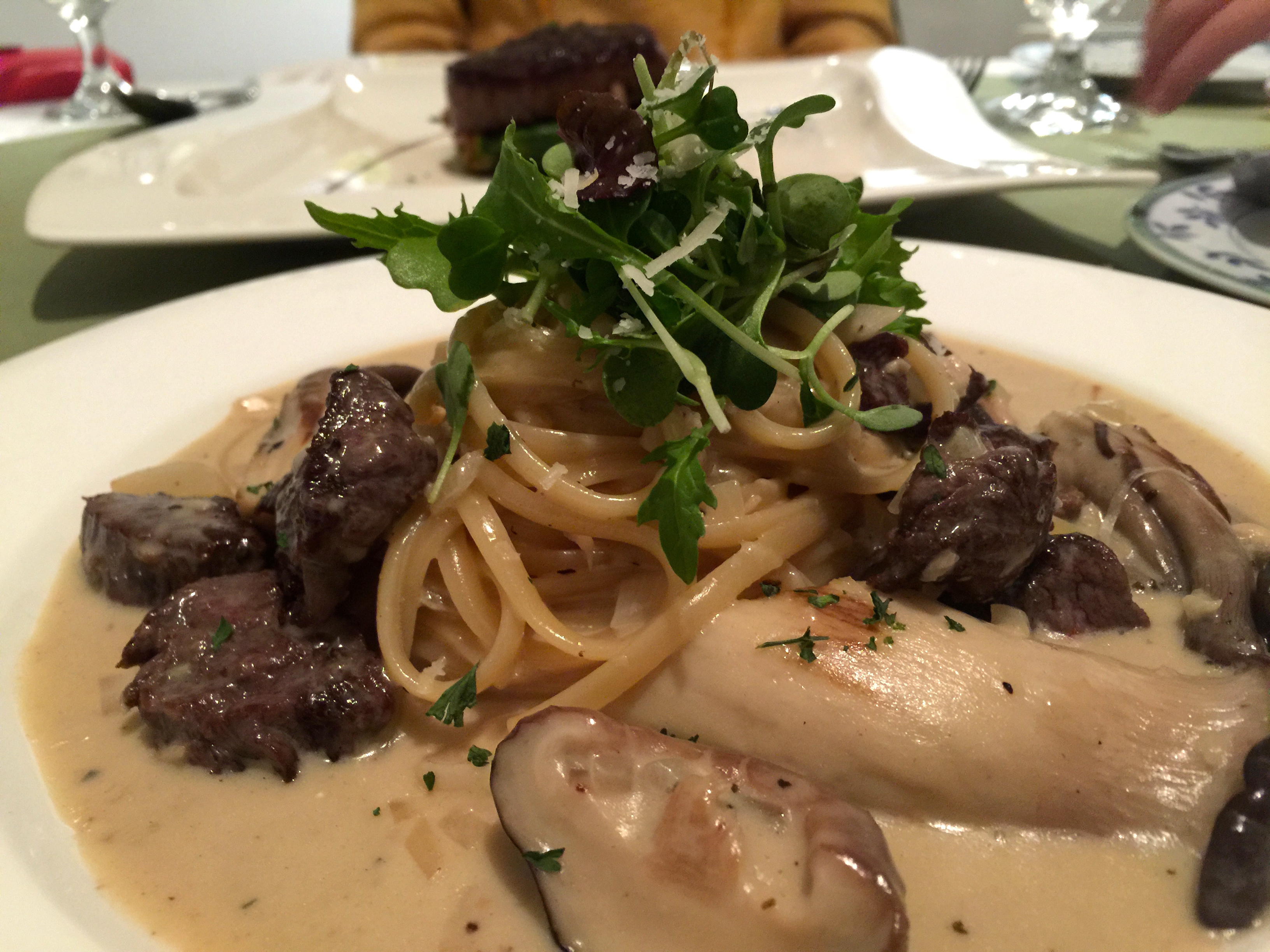 메인 요리인 크림 파스타는 직접 만든 생면의 농밀한 맛에 부담 없는 크림소스, 한우와 버섯의 쫄깃함이 잘 어우러져 있다.