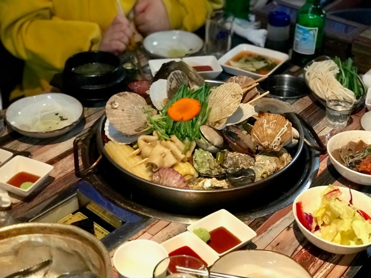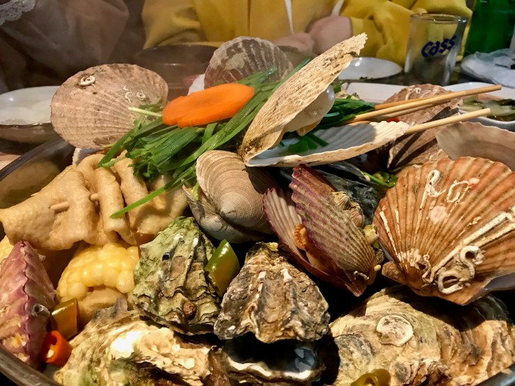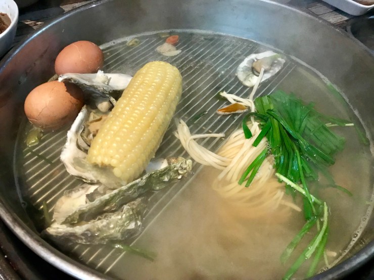조개찜은 증기로 쪄서 준다. 각종 조개와 굴에다가 오뎅과 계란, 옥수수까지 주는 점이 특이하다.