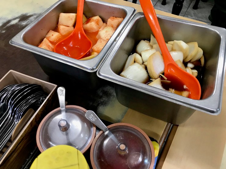 고추와 쌈장, 깍뚜기와 양파간장이 나온다.