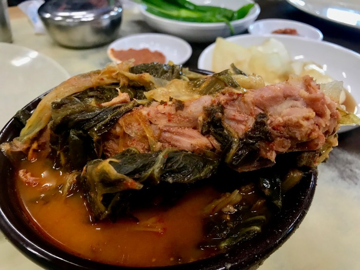 비주얼은 막강하다. 거대한 돼지뼈와 우거지가 뚝배기가 터질 듯 담겨져 있다.