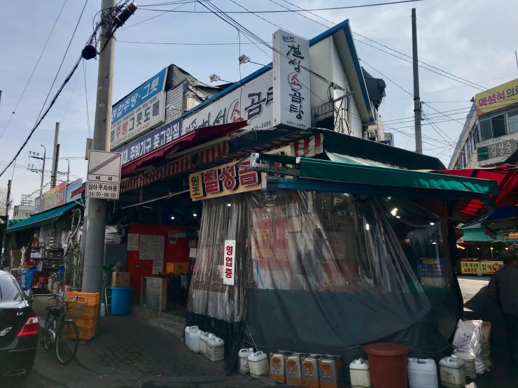 대구에서 가장 크고 유명한 시장은 온갖 먹거리가 가득한 서문시장이다. 두 번째는 칠성시장을 꼽을 수 있다. 최근 문재인 대통령이 정치인들의 단골 방문장소인 서문시장 대신 칠성시장을 방문해서 화제가 된 적도 있다. 이 칠성시장은 장어구이 등 해산물 먹거리, 보리밥으로도 잘 알려져 있지만 족발과 연탄석쇠불고기를 파는 ‘돼지골목’ 역시 유명하다. 오늘 소개할 곳은 이 돼지골목 입구에 있는 소머리국밥 식당, 영업한 지 50년이 넘었다는 원조 칠성소곰탕이다.