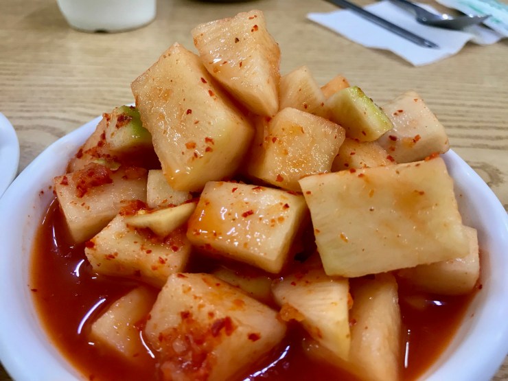 밑반찬은 깍두기와 배추김치, 양파간장을 준다.