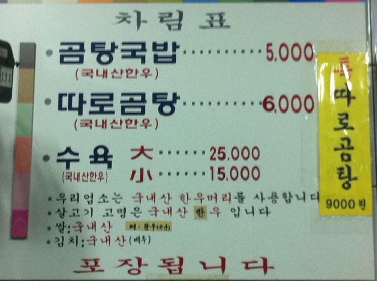 지금은 곰탕 9천원, 수육 소가 2만5천원으로 두 배 가까이 올랐다. 당시보다 이런저런 메뉴도 많이 생겼다. 또한 옆 가게까지 터서 면적이 두 배 가까이 커졌다.