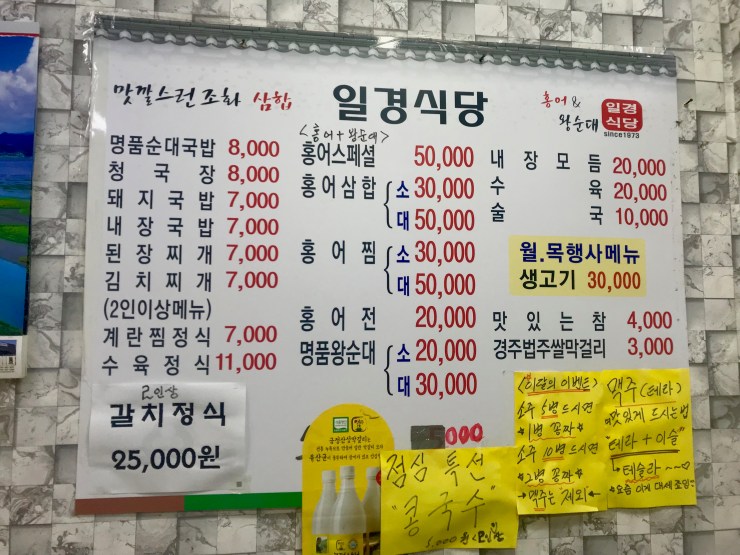 가격은 순대국밥과 청국장 8천원, 계란찜정식 7천원이다. 홍어요리와 순대도 따로 먹을 수 있다. 월요일과 목요일에는 생고기도 3만원에 판매한다.