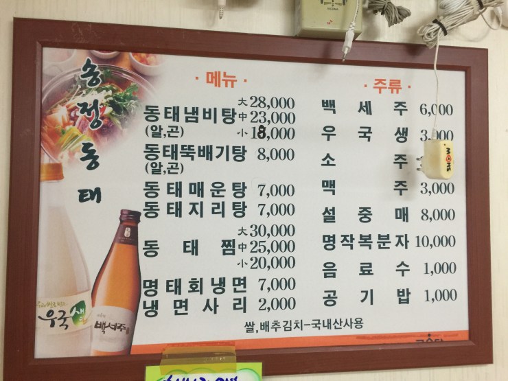 2015년9월에 갔을 때는 동태찜 소 2만원, 대 3만원이었다. 동태냄비탕 대 2만8천원이었고 오징어순대는 없었다. 4년 만에 2천원에서 5천원 정도씩 올랐다.