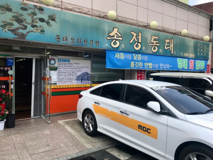 얼린 명태, 동태는 해장의 대표 메뉴 중 하나이다. 흰살 생선이다보니 비린내가 잘 나지 않아 국물을 내기에 적당하다. 매콤한 양념을 얹은 찜에도 잘 어울리는 식재료인데, 오늘 소개할 곳은 일반적인 동태찜과는 조금 다른 맛을 내서 치열한 논쟁의 중심에 선 곳, 송정동태이다.