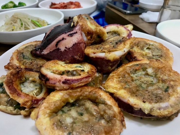 오징어 몸통에 밥과 야채, 오징어살을 다져 넣고 밥전처럼 구워냈다.