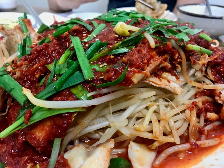 이 집 동태찜은 동태 위에 콩나물, 그 위에 양념, 그 위에 부추가 올려져 있다.