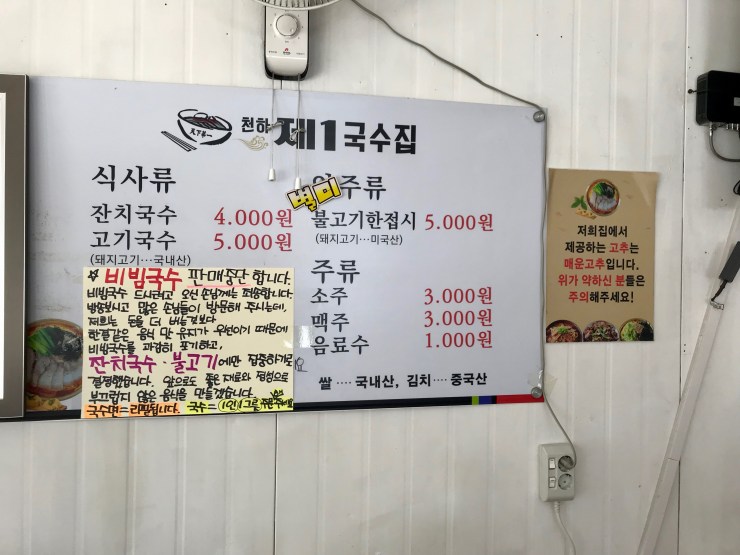 가격은 잔치국수 4천원, 고기국수 5천원, 불고기 5천원이다. 맥주는 3천원에 판매하고 있고 비빔국수도 판매하다가 최근 TV에 출연한 뒤 손님이 너무 몰려 비빔국수는 안 팔기로 했다고 한다.
