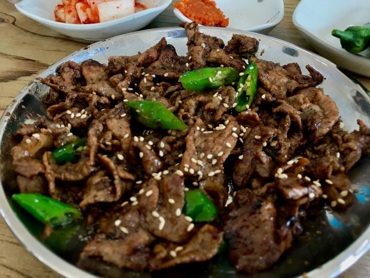 연탄불과 석쇠에 굽는 대신 후라이팬에서 굽는데, 불맛도 적당히 나고 약간의 느끼함을 잡기 위해 고추도 들어가 있다.